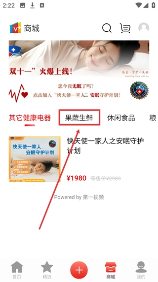 2、在商城页面,找到【果蔬生鲜】分类并点击,可进入该分类的商品列表页面,查看相关商品。