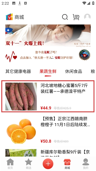 3、进入果蔬生鲜商品列表后,点击【河北坡地糖心蜜薯】条目,可进入该商品的详情页面。