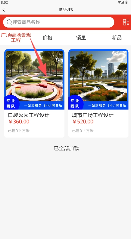 2、在分类页面选择“公共景观工程”并点击其下的“广场绿地”子类进入。