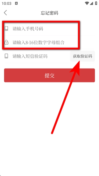 3、进入忘记密码页面后,先输入手机号码,接着设置新密码,再点击“获取验证码”按钮。