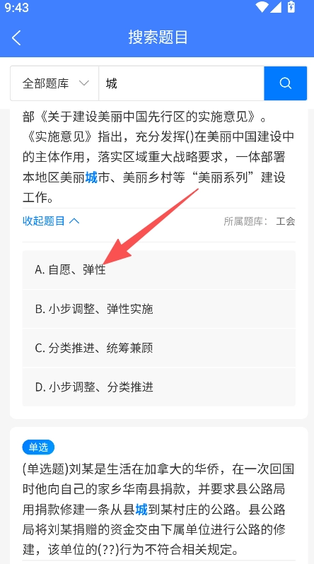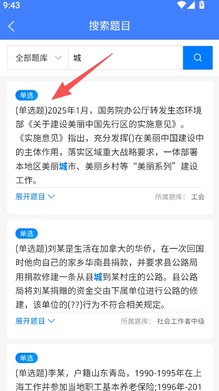 2、搜索结果展示单选题型,标注所属题库,可展开题目查看选项,呈现题目完整内容,辅助开展备考相关练习。
