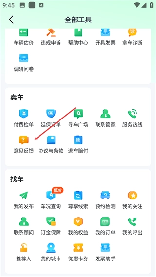 2、在卖车板块,点击【意见反馈】,进入反馈填写界面。