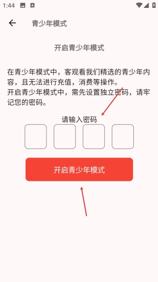 4、进入青少年模式页面后,先输入密码,再点击【开启青少年模式】按钮,就能完成该模式的开启流程。