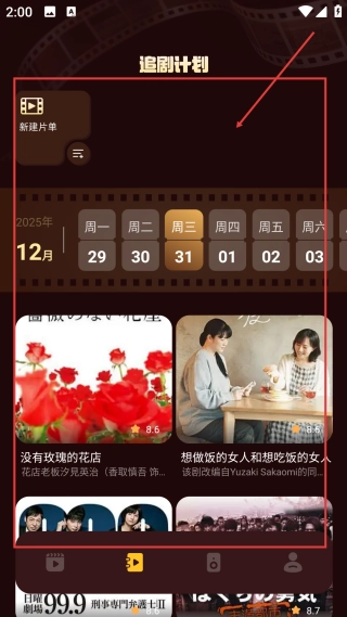 2、在追剧计划页面,新建片单后,可通过选择日期来查看该日期对应的影视推荐内容。