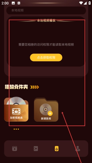 3、进入本地视频页面,完成【获取权限】操作后,即可使用【加密视频库】等播放文件夹相关功能。