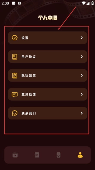在个人中心页面,用户可以选择【设置、用户协议】等选项,以完成与账号相关的各项功能操作。