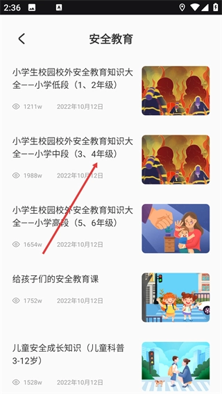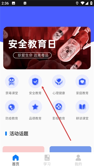 1、在首页找到【安全教育】的功能入口并点击,即可进入安全教育课程的分类列表页面。