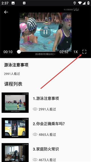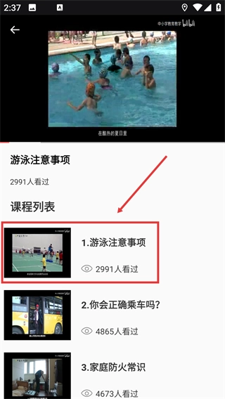 3、进入课程内容页面后,挑选具体的子课程(例如【游泳注意事项】),即可进入该子课程的学习界面。