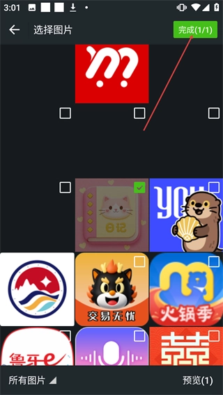 4、在相册页面选定目标图片后,点击右上角显示为【完成(1/1)】的按钮,就能完成照片上传的选择步骤。