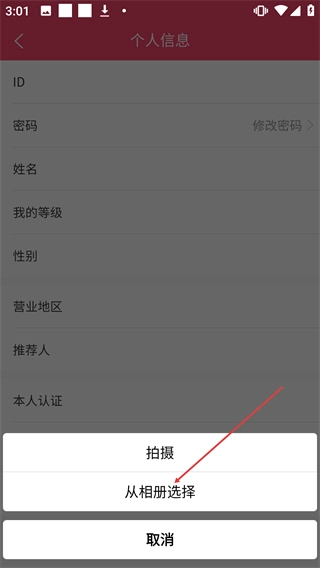 3、在弹出的窗口里选择【从相册选择】选项,就能进入相册图片的选择界面。