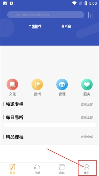 1、进入首页后,能看到【个性推荐】【精品课程】等板块,这些板块包含【文化】【服务】类内容,点击底部的【我的】即可进入个人中心。