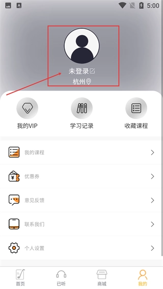 2、进入【我的】页面后,能看到【未登录】状态和定位信息,同时还有【我的VIP】-【学习记录】等功能,这些功能需要登录后才能解锁使用。
