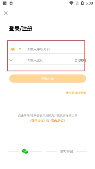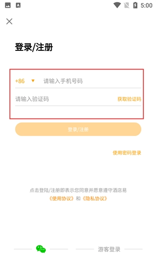 3、进入【登录/注册】页面,选择验证码登录/注册方式,在【+86-请输入手机号码】处填写号码,点击【获取验证码】并填入收到的验证码,即可完成登录/注册操作。