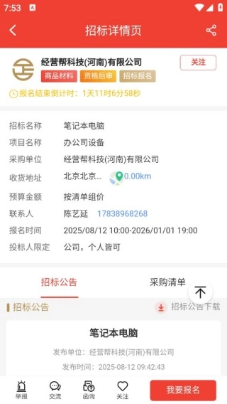 4、点击右下方的“我要报名”按钮,即可参与到招标活动中。