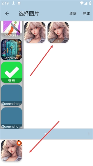 3、进入图片选择界面后,从指定文件夹(例如Pictures文件夹)里挑选好需要的图片;若需调整已选内容,可点击“清除”按钮操作;确认所选图片无误后,即可进入视频编辑阶段。
