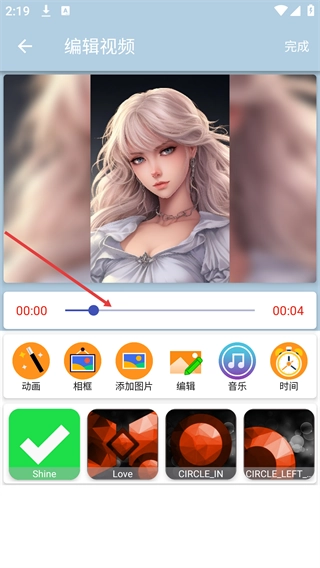 4、进入视频编辑页面后,能借助进度条来调整视频时长,还可以运用动画、相框等功能对视频进行编辑操作,全部完成后,点击页面右上角的“完成”按钮即可导出编辑好的内容。