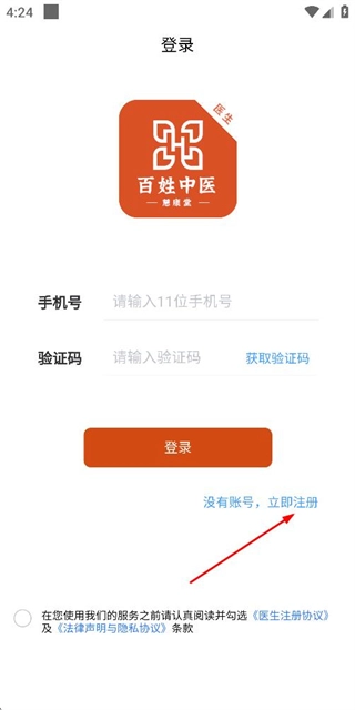 在百姓中医的登录页面找到“立即注册”按钮并点击,即可进入注册信息填写界面。