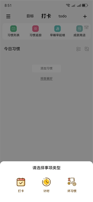 2、添加习惯时支持选择不同类型的项目,以实现差异化管理。