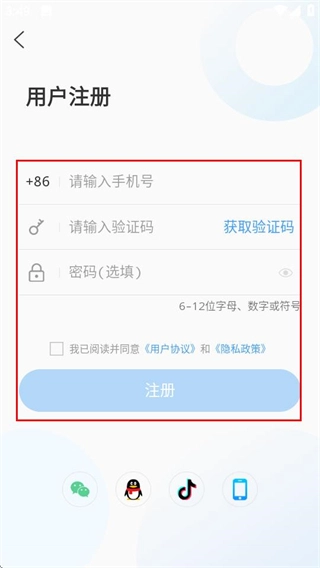 3、在登录页面,点击快速注册选项,即可进入用户注册页面。