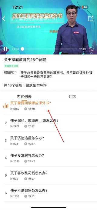 3、在家庭教育课程列表中选择感兴趣的课程条目,比如关于家庭教育的16个问题,点击该条目,进入课程详情页面。