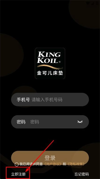 1、在金可儿床垫的登录界面,点击【立即注册】按钮,跳转至注册信息填写页面。