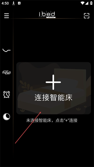4、登录后进入i bed功能页面,在“连接智能床”区域点击“+”按钮,即可启动智能床的连接流程(当前页面状态为“未连接智能床”)。