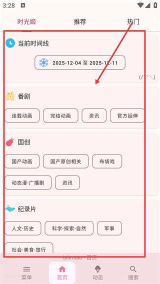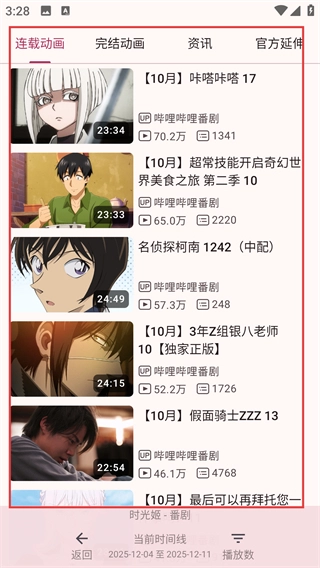 1、在时光姬页面可以看到【当前时间线】以及番剧、国创等分类,点击对应的分类标签就能进入相应的内容页面了。