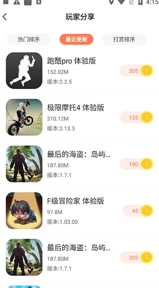 2、排行榜中有许多玩家们分享的游戏资源,都是以后的版本,点击热门排序、最新更新或是打赏排序来筛选自己感兴趣的。