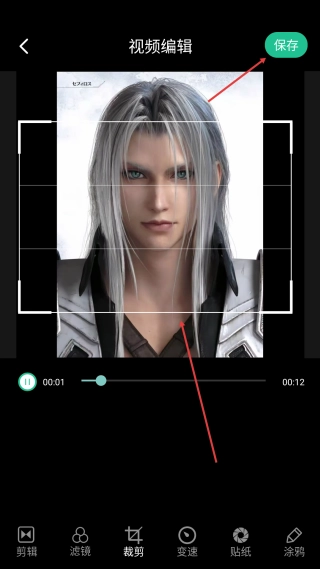 4、进入裁剪调整页面后,先对画面进行【调整】,之后点击右上角的【保存】按钮,就能完成视频裁剪的操作了。