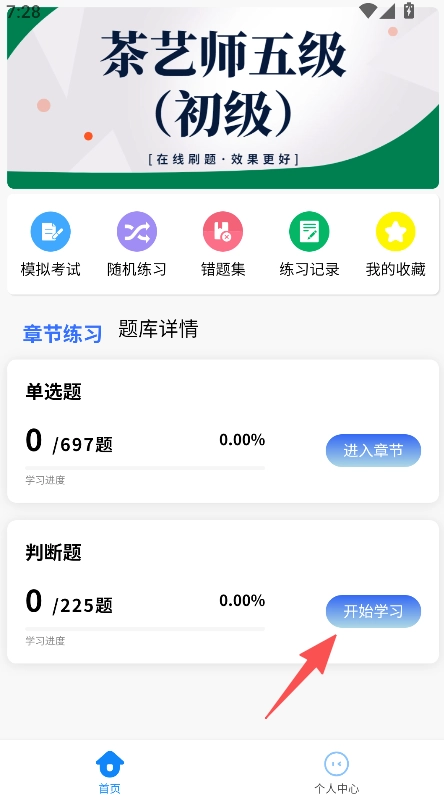 1、具备章节练习功能,用户进入首页后选择对应的题型,点击“开始学习”按钮,即可进入茶艺师考试相关题目的答题界面。