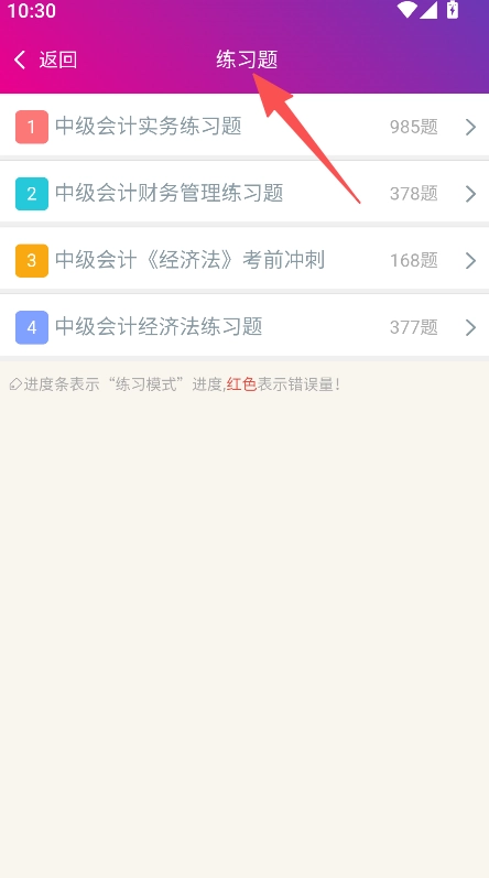 1、具备科目练习题选择功能,用户进入练习题页面后,可选择实务、财务管理等科目的练习题,从而进入对应的练习板块。