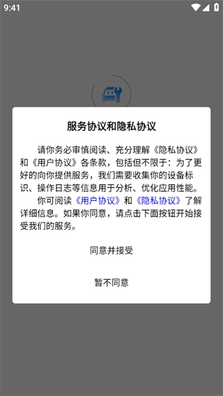 1、初次使用时,请先仔细阅读并同意用户协议与隐私政策,之后点击“接受”按钮进入应用。
