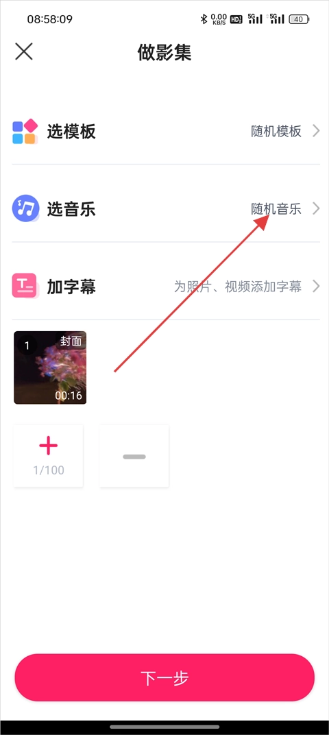 3、素材选好后,点击【选音乐】;