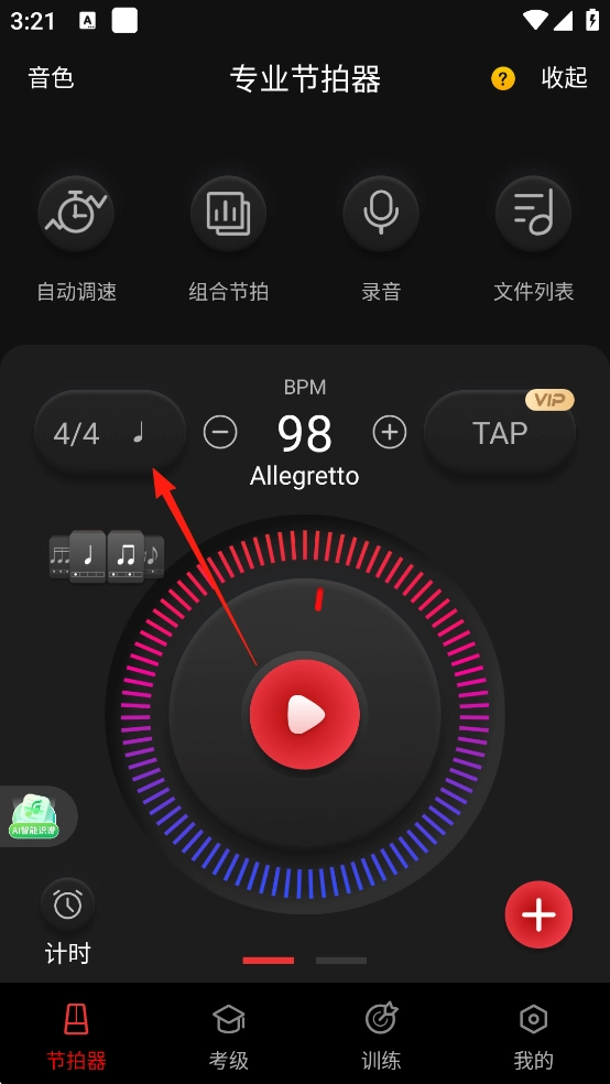 点击左侧的节拍调整按钮(如 `2/4`、`3/4`、`4/4`),选择适合的拍号。