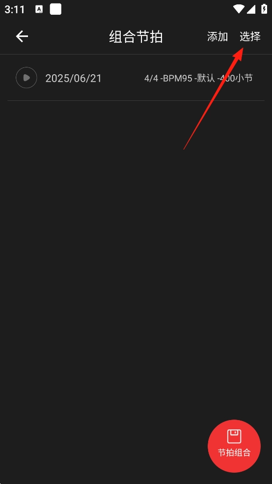 2、进入【组合节拍】界面后,可以看到自己已经添加的节拍,点击【选择】