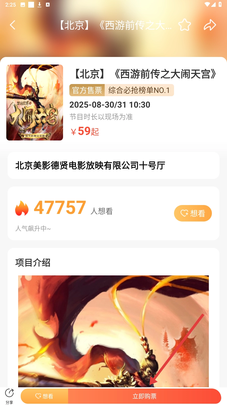 2、在必抢榜单,选心仪演出(如【北京】《西游前传之大闹天宫》),查看详情。
