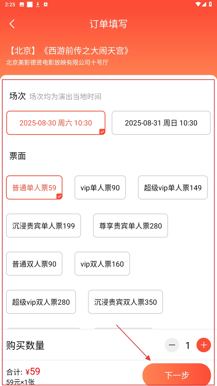 4、在订单填写页,选场次、票面、数量,点【下一步】完成购票。