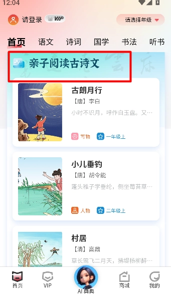 1、打开《中版教育》,进入亲子阅读板块,挑选古诗词开展阅读学习。