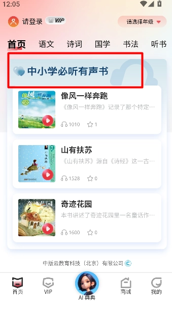 3、进入中小学有声读书栏目,挑选书籍就能开启收听。