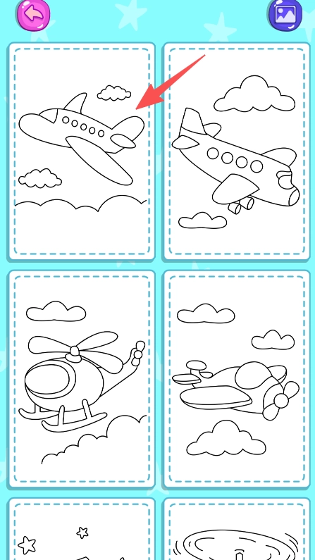 1、具备多样主题的模板选择功能,包含汽车飞机帆船等形象,支持选定对应模板,进入对应的涂色操作页面。