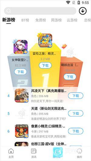 4、排行榜:新游榜、BT榜、免费榜、网游榜、云游榜、总榜。
