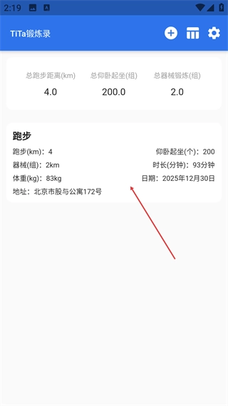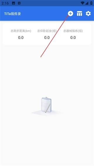 2、在主界面可查看【总跑步距离(km)】【总仰卧起坐(组)】等数据,点击顶部的【+】按钮,就能进入记录添加页面。