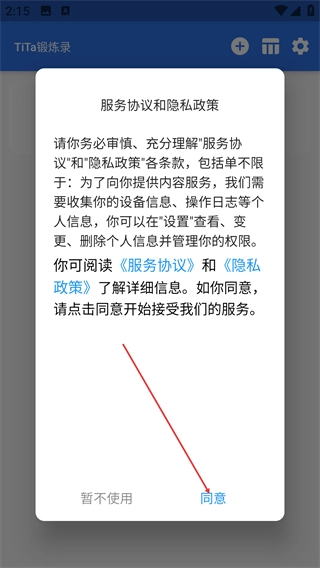 1、进入【TiTa锻炼录】应用后,首先请仔细阅读【服务协议】与【隐私政策】,确认无误并同意相关条款后,点击【同意】按钮,就能进入软件的主界面。