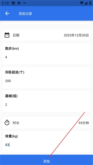 3、进入【添加记录】页面后,填写【跑步(km)】【仰卧起坐(个)】等相关信息,在确认所填内容无误后,点击页面底部的【添加】按钮,即可完成记录的添加操作。