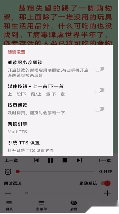 4、之后在其他看小说的软件里,选择用系统默认的TTS引擎或MultiTTS朗读就行;