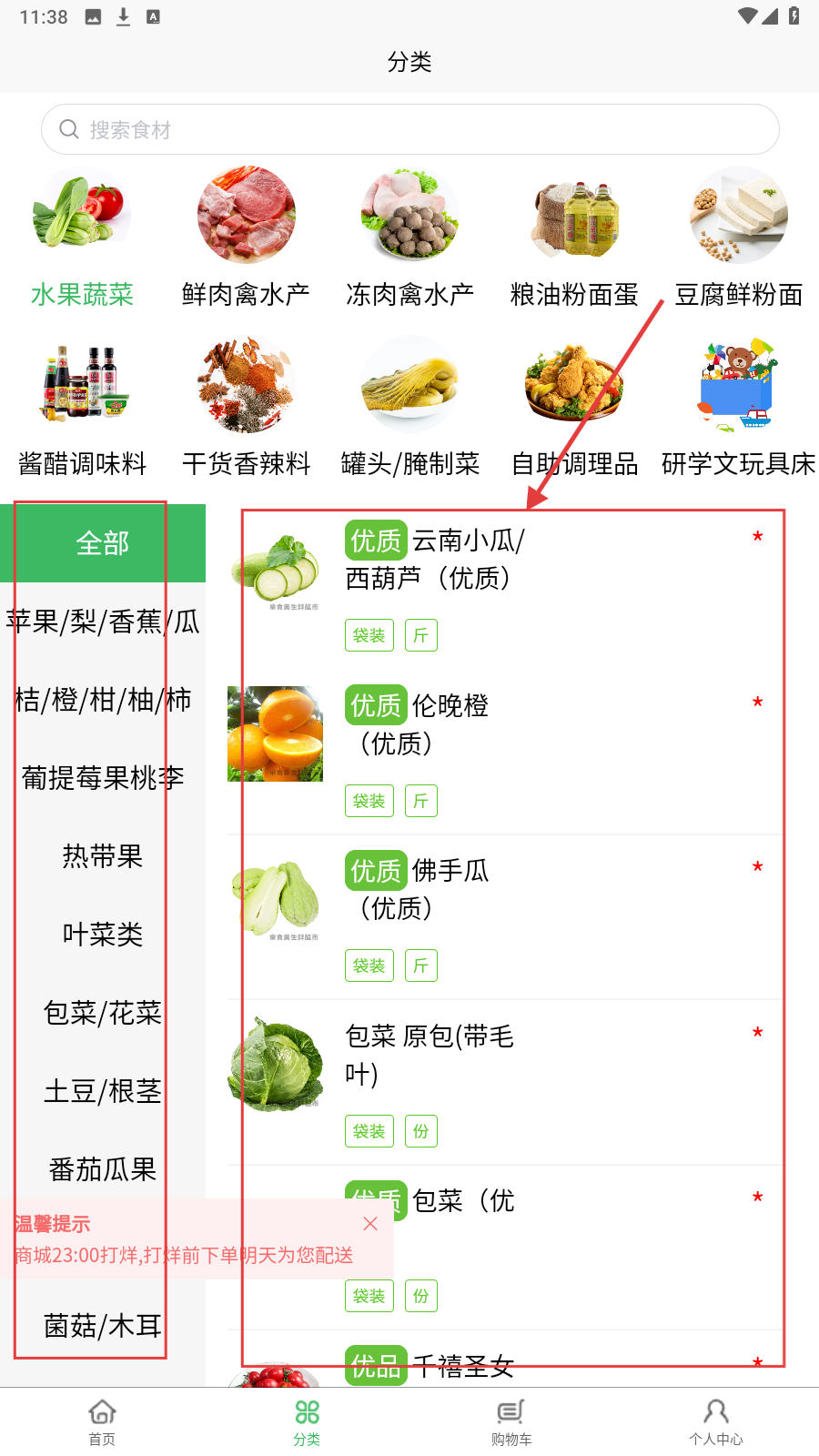 2、进入分类页,左侧选细分品类,右侧浏览具体商品,筛选符合需求的生鲜。