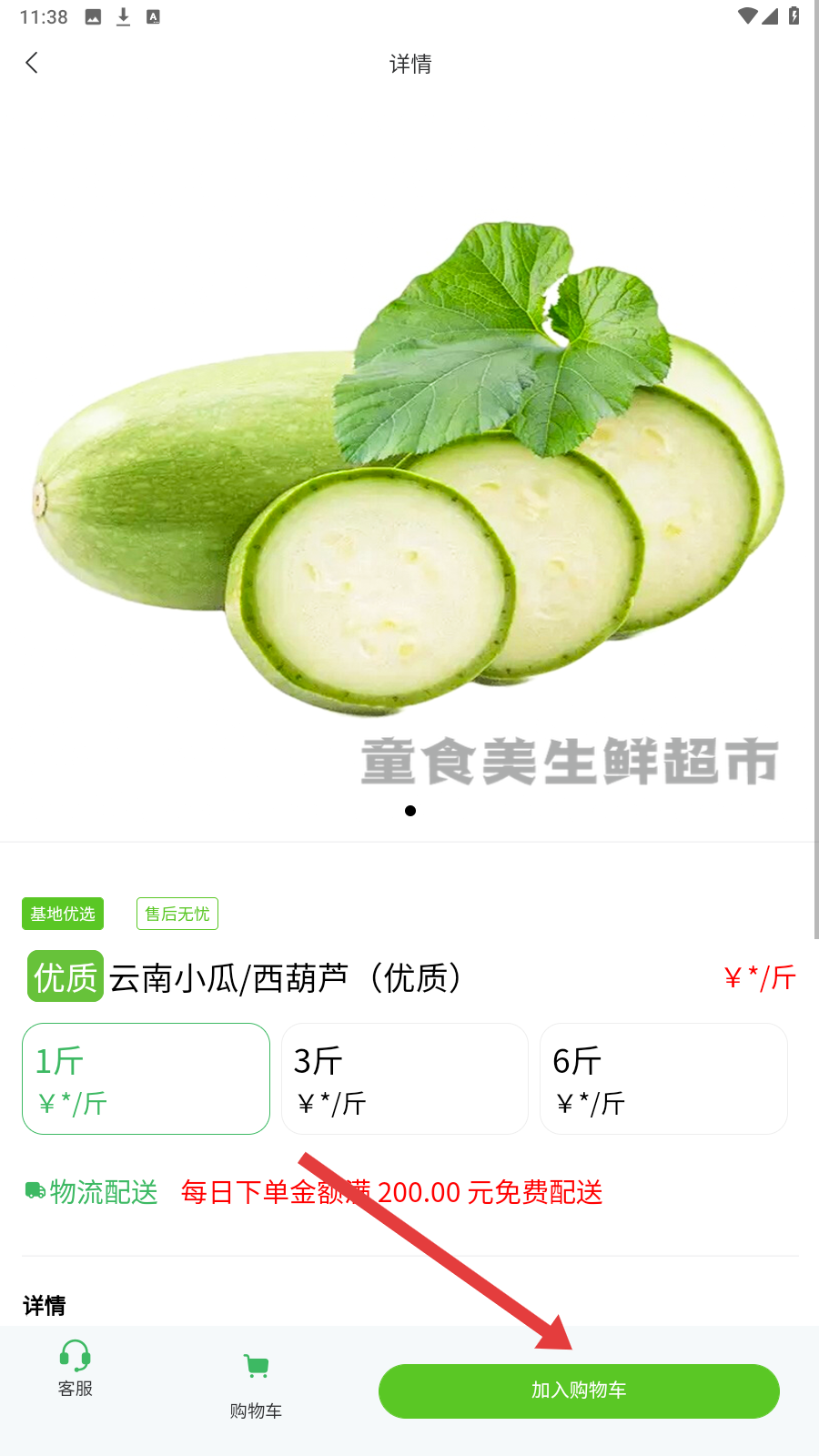 3、看中商品如【云南小瓜/西葫芦(优质)】,点击【加入购物车】,准备结算。