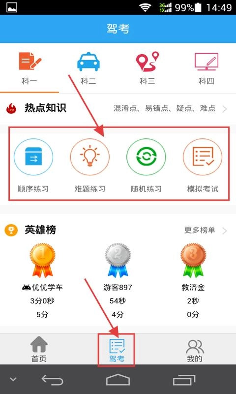 3、点击底部【驾考】按钮,进入驾考页面,选择【顺序练习】【难题练习】等模式,进行科目一至科目四的习题练习。