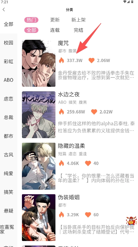 2、在分类页在列表中找到目标漫画。