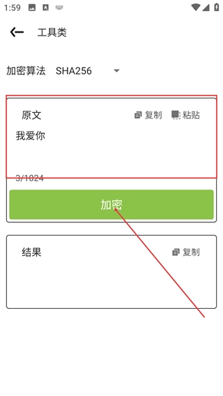 3、进入加密工具页面后,挑选加密算法(例如SHA256),接着在“原文”输入框里填入想要加密的内容(像“我爱你”这样的示例内容)。